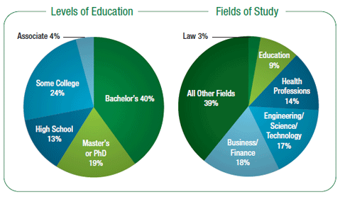 While the immigrant clients who have their credentials evaluated by WES are not necessarily representative of the broader skilled-immigrant population in the United States, these concluding charts illustrate the levels and fields of study that WES’s immigrant clients hold.