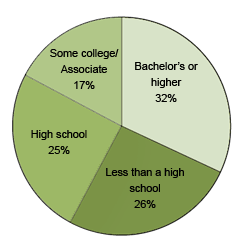 The educational attainment data essentially mirrors the occupational data: immigrant populations are concentrated at the poles: a large number having at least a bachelor degree or no high school diploma at all.