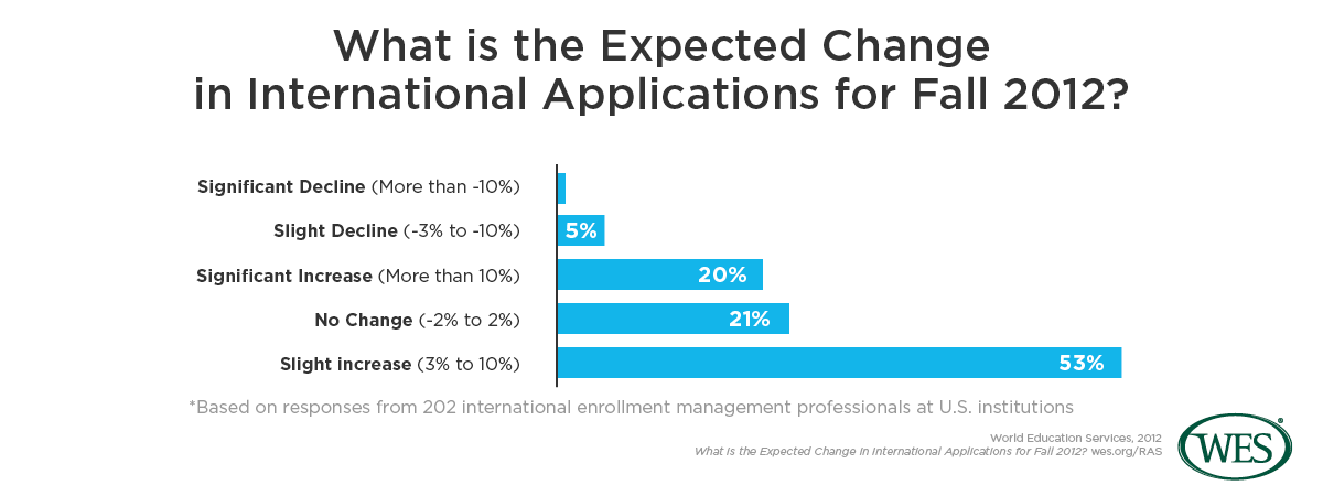 Three out of four international admissions professionals at U.S. institutions of higher education expect applications from international students to increase for the fall 2012 admissions cycle (incoming class of 2013). Of the 202 respondents to WES’ March survey, only 5% expect a slight decline in international applications, as compared to one-fifth of respondents who are expecting a significant increase of more than 10%. Overall, it seems that most institutions are expecting an increase of some degree, which suggests a healthy upward trend in international enrollments for 2013.