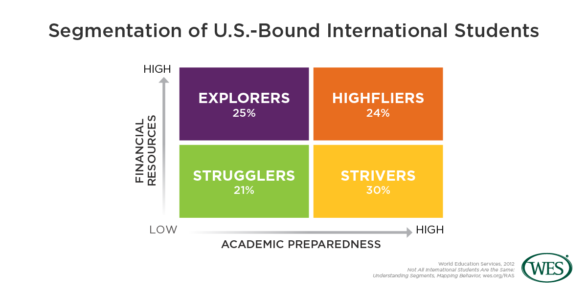 For this study, we segmented the U.S.-bound international student population along two dimensions: academic preparedness and financial resources. We used information on English proficiency and other criteria to categorize our survey respondents as having either high or low levels of academic preparedness. Similarly, we distinguished between individuals with high and low financial resources based on whether respondents expected institutional financial aid to be available to them. Using our survey data, we established the following four segments of U.S.-bound international students: