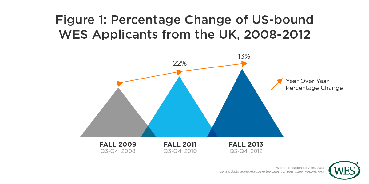 WES application data show an increase of 22 percent in UK applications from Q3-Q4’2008 (Fall 2009) to Q3-Q4’2010 (Fall 2011). Preliminary numbers from Q3-Q4’2012 (Fall 2013) show a 13 percent increase in applications as compared to the same period in 2010. Combined with anecdotal evidence from other sources, these figures suggest that more UK prospects will be applying to U.S. universities and colleges for the 2013-14 academic year.