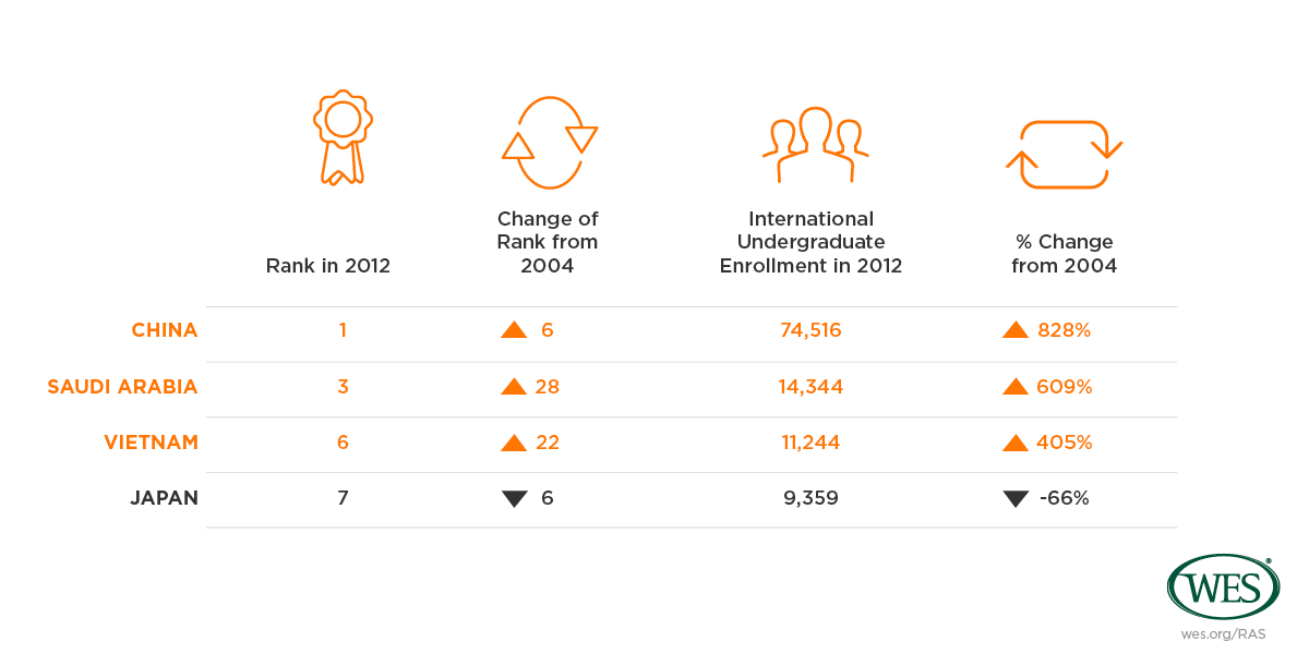 Shift of International Undergraduate Students from Selected Top Source Countries in the U.S., 2012 vs.2004