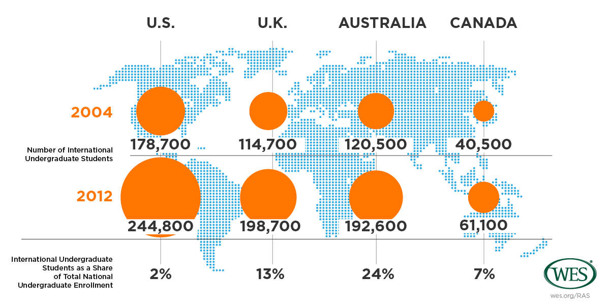 Sources: Institute of International Education (IIE); Higher Education Statistics Agency (HESA); Department of Education, Employment and Workplace Relations (DEEWR); Statistics Canada (SC); WES Research & Advisory Services fall 2012 survey.