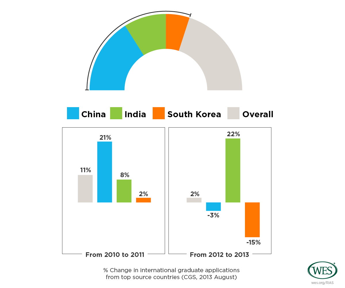 Graduate applications from international students remained flat from 2012 to 2013 due to a sharp decline in interest from China and South Korea. However, Indian applications jumped 22% after slow growth from 2009 to 2012.
