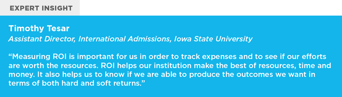 As noted above, our research revealed that most institutions measure ROI based on a simple quantitative metric: the number of students who matriculate. However, some institutions have begun to tease out more effective ways of measuring the ROI of international student recruitment initiatives.
