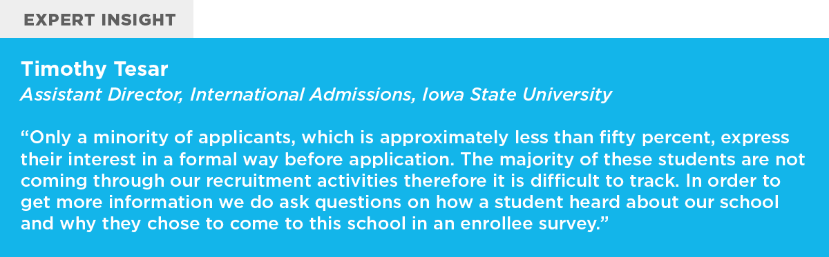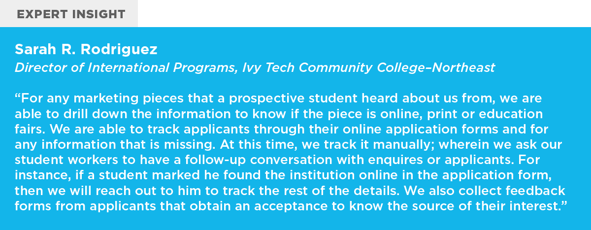 Traditional recruitment activities such as overseas recruitment trips can be calculated based on the cost-per-lead, cost-per-applicant, and cost-per-enrollee for each school or country visited, with time periods ranging from one to three years. Measurement should take place (and be reviewed) on a month-to-month or year-to-year basis for comparison. Some institutions have tracking processes and tools in place for this purpose. There are likewise mechanisms for tracking other traditional recruitment tools such as commission-based agents, advertising or purchasing leads. By designating each activity with a specific source code that then goes into a database, institutions are able to quantify returns.