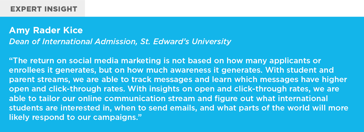 They also noted the difficulty of quantifying its benefits in any meaningful way. Digital or social media marketing, with its built-in analytics platforms, is, on one level, easy to measure. Most institutions consider the key performance indicators (KPIs) of their digital marketing based on brand engagement, brand awareness, and word-of-mouth publicity. Currently, KPI’s from digital and social media marketing are measured on the basis of simple interactions such as page views, followers, and the number of clicks, shares, and “likes” through platforms such as Google Analytics. However, these measurements are often only loosely tied to other metrics around recruitment.