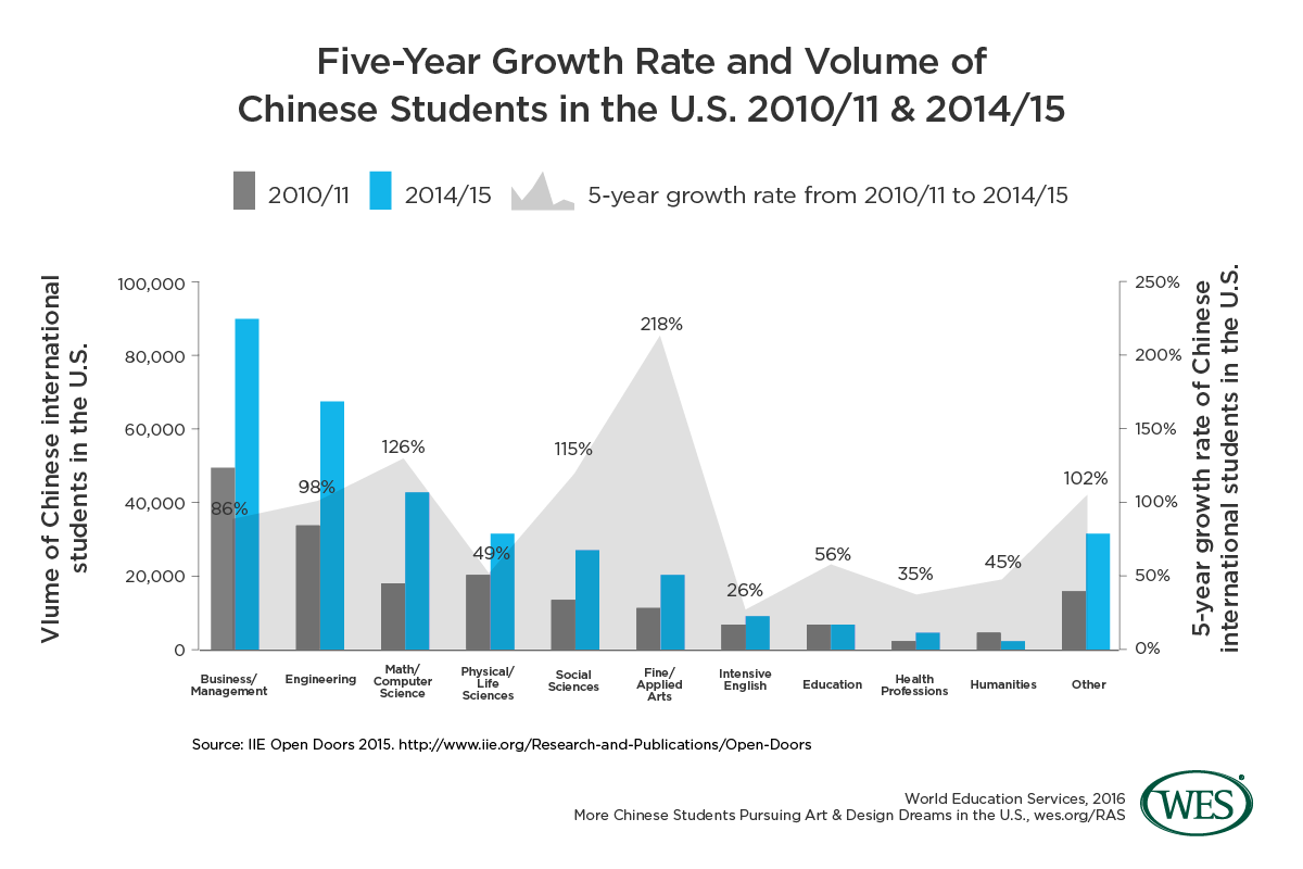 The growth of Chinese international student enrollment in U.S. higher education over the last five years has slowed from more than 20 percent in 2010/11 to 11 percent in 2014/15. Nonetheless, interest in certain areas of study is still on the rise; for instance, the number of Chinese students enrolled in fine and applied arts programs has more than tripled — a much faster rate of growth compared to the traditional leading fields of studies, such as engineering, business and management, and math and computer science.