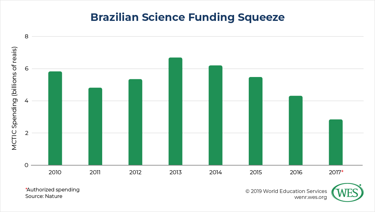 While the economy has since improved, the Brazilian government had to cut back on public expenditures, including spending on research and science. In 2016, the government capped budget increases for science at inflation rates for 20 years, effectively freezing spending for the next two decades. This freeze followed a decrease of Brazil’s science budget by more than 40 percent over the previous three years.