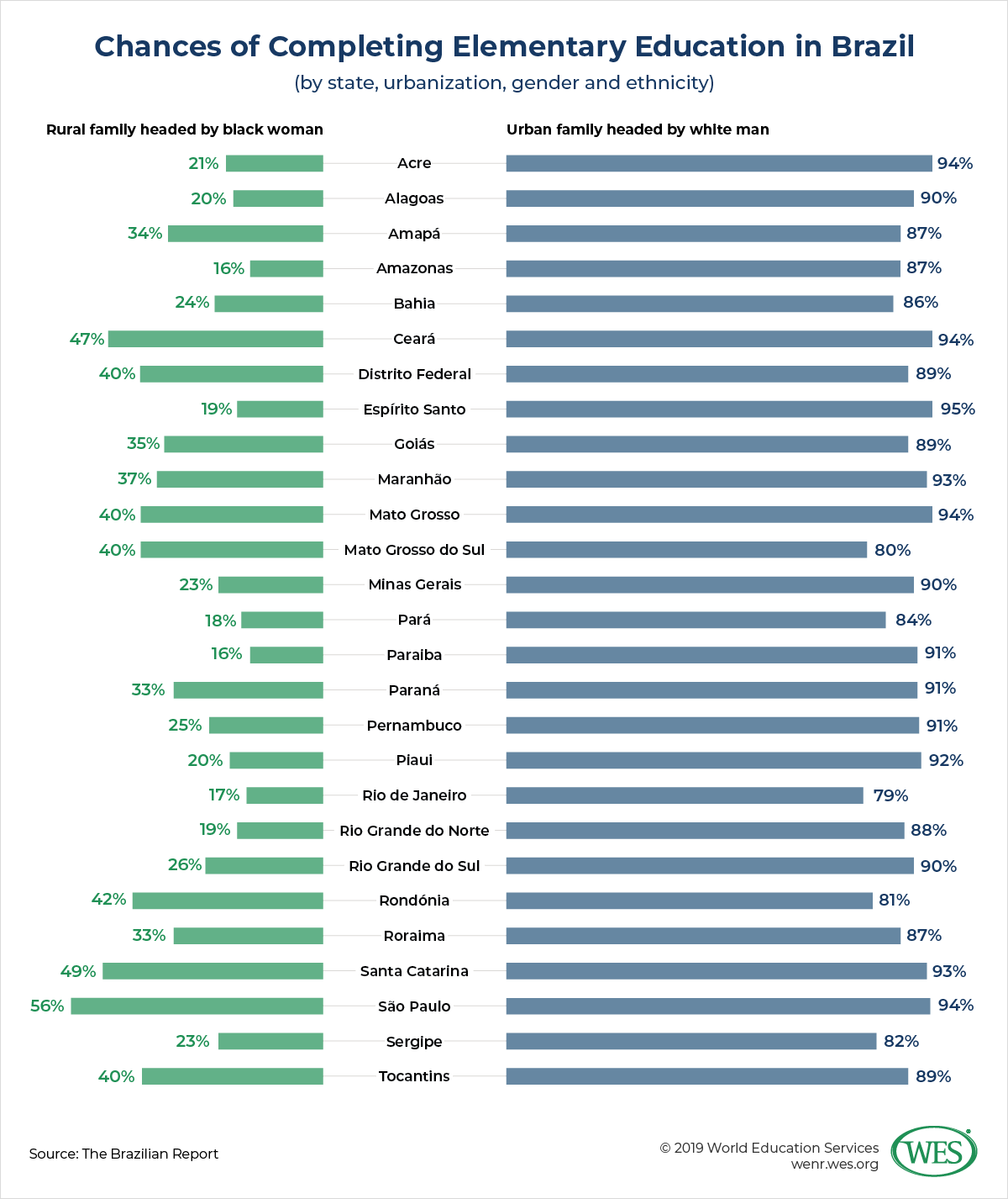 Brazilian education is characterized by wide disparities in resources, access, and quality based on geographic location, socioeconomic status, and ethnicity. To name some examples, the lower-secondary graduation rate in the metropolis of Sao Paolo stood at 93 percent in 2015, but did not exceed 63 percent in the underdeveloped state of Alagoas. Upper-secondary completion rates ranged from 66 percent in cities to 43 percent in rural areas. Higher education attendance was as high as 47 percent among the richest segments of Brazilian society, but only 5 percent among the poorest. Whites have completed 2.5 more mean years of education than indigenous peoples. Private schools, which tend to outperform public schools in terms of learning outcomes, cost as much in fees as poor households earn in total income and are therefore mostly reserved for privileged elites.