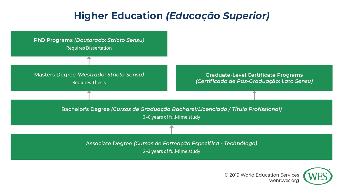 Degrees awarded in Brazil are organized in two main categories. The first, graduacao, includes shorter associate degree-type qualifications (tecnólogos), teaching degrees (licenciaturas), bachelor’s degrees (bachareis), and professional degrees (titulos profissionais). The second category is pos-graduacao, which includes shorter, graduate certificates, and then master’s and doctoral degrees.