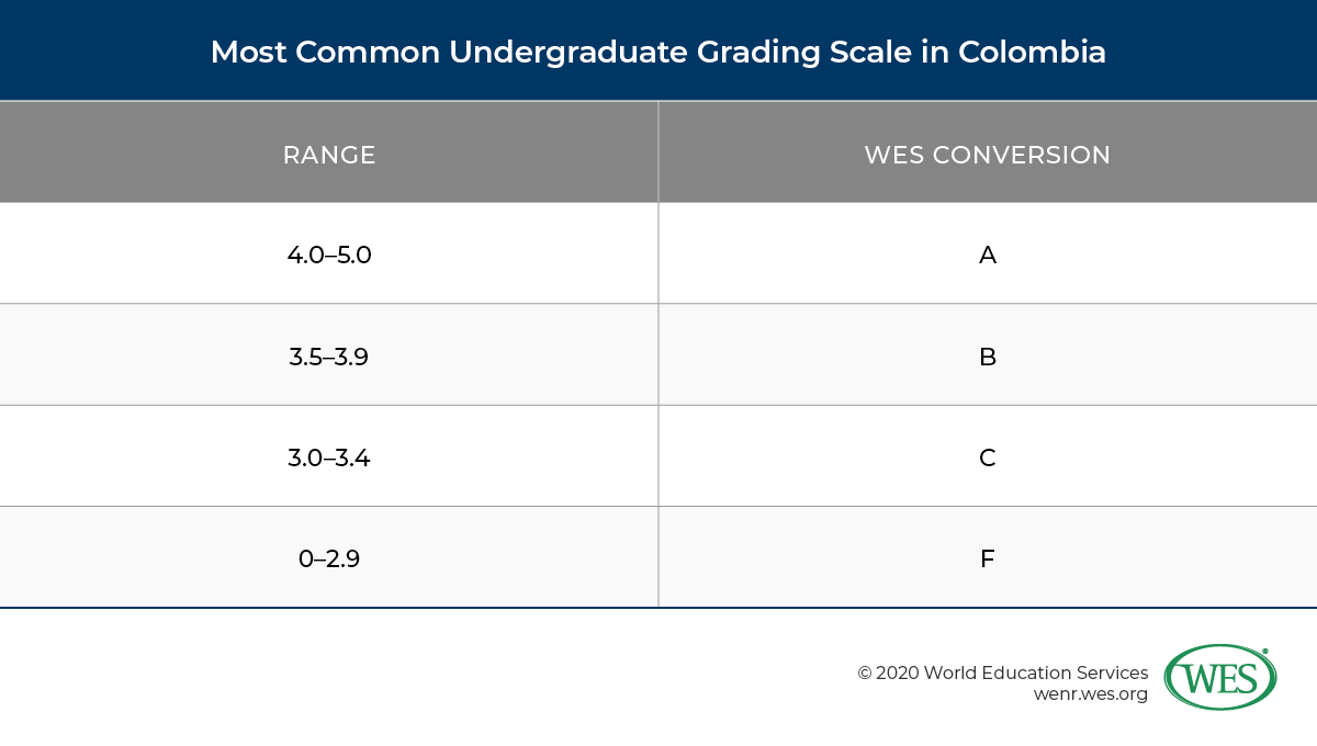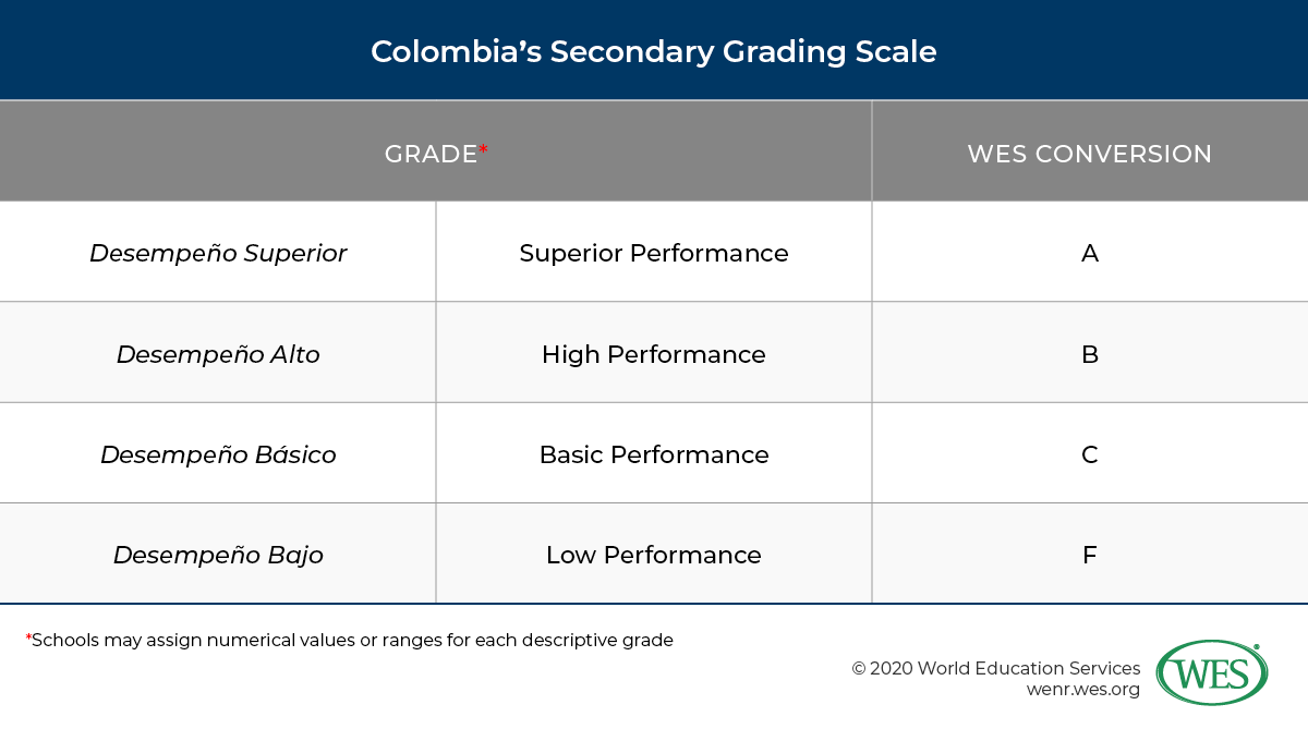 Graduates receive a diploma and title that denote the type of program, that is, either the Título de Bachiller Académico (title of academic bachelor) or the Título de Bachiller Técnico (title of technical bachelor). Schools set their own graduation requirements—the MEN does not impose regulations—but most institutions require a minimum grade average that is determined by internal examinations and other criteria. The MEN has set forth a national grading scale, but schools are free to use their own “institutional student assessment systems” as long as they also convert their grades to the national scale (shown below). This means that academic transcripts from schools that use alternative scales, numerical or otherwise, typically list both the institutional grade and the converted national grade on their academic records.