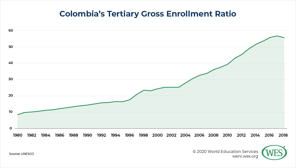 Given these disparities, it’s good news that access to education is increasing. While Colombia has not yet accomplished its objective of becoming Latin America’s “most educated country”—a goal former president Juan Manuel Santos set out to achieve by 2025—efforts to increase spending and participation in education have paid off as of late. The tertiary gross enrollment ratio (GER), for instance, almost doubled from 28 percent in 2004 to 55 percent in 2018, according to UNESCO. The number of expected years of schooling in Colombia has increased by fully two years since 2007.