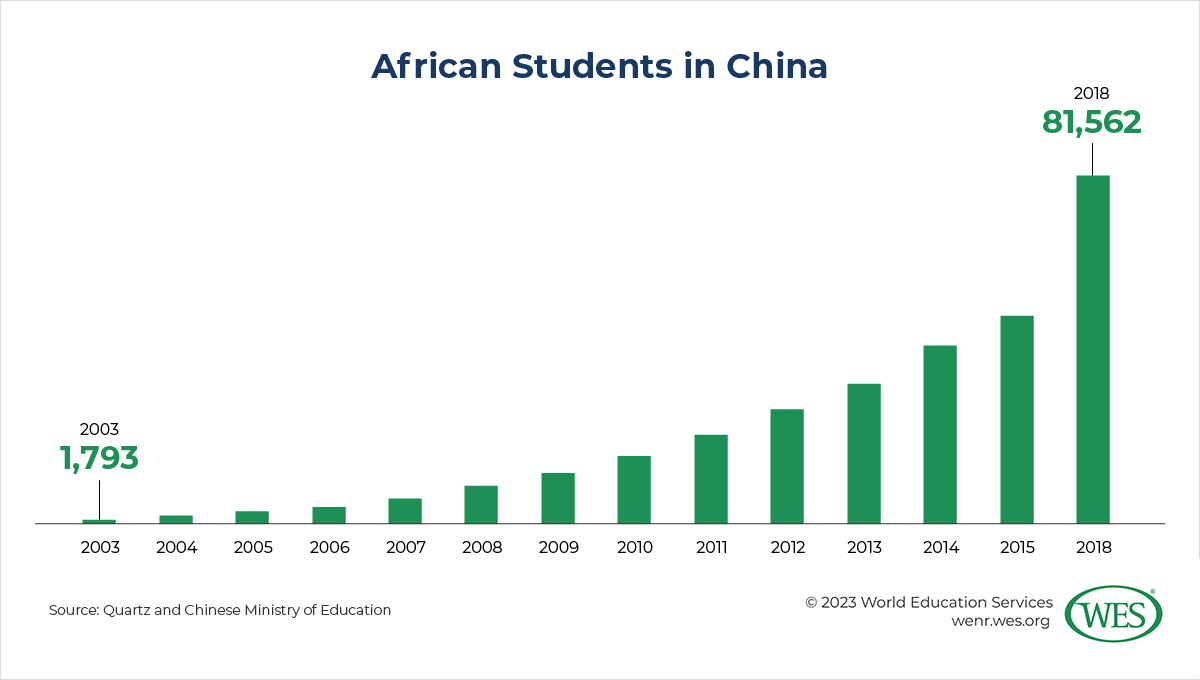 Notably, China in recent years has become a major study destination for Africans as well. Pre-pandemic data released by the Chinese government reflects that the number of African students there has spiked greatly, reaching more than 80,000 in 2018. This trend coincides with China’s emergence as Africa’s largest trading partner and the country’s growing engagement on the continent, including in education. However, the Chinese data cannot be directly compared with UIS statistics, which count only tertiary degree-seeking students and don’t report numbers for China. The Chinese data, by contrast, also include students in high school and in various short-term vocational training programs, some of which last just a few days or weeks. Russia is another country intent on expanding its influence in Africa through education-related cooperation. The Russian government seeks to raise the number of African students in Russia to 40,000 by 2024 and has greatly ramped up scholarship funding to achieve this objective.
