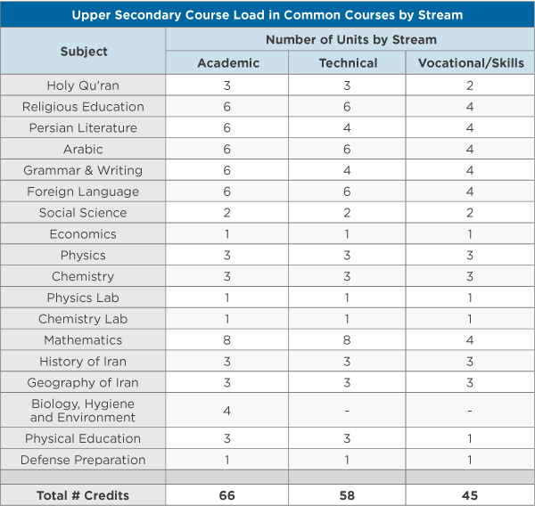 Students are streamed into three 3-year branches: Academic (Nazari), technical (Fani Herfei), and vocational/skills (Kar-danesh). A student’s stream is dependent primarily on his or her examination results at the end of the lower secondary cycle (grade 8), and to a lesser extent student preference. The academic stream has traditionally been the most popular.